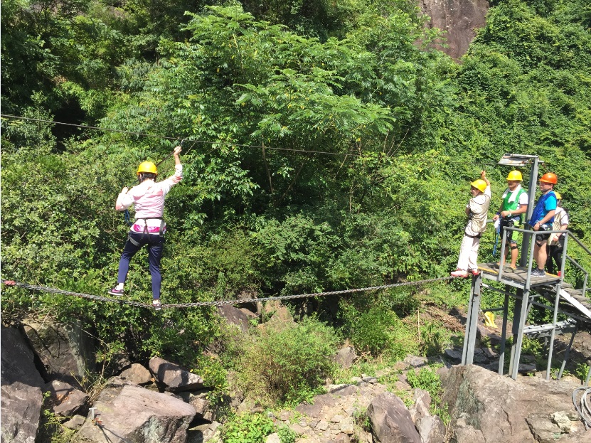 一天的歡笑與汗水中,我們體會到了團(tuán)結(jié)協(xié)作、互相信任、咬牙堅(jiān)持、敢于嘗試、突破自我的重要性。大穿越環(huán)節(jié)正是一天最熱的時(shí)候,沒有人輕言放棄,抓住安全繩穿越滑翔的那一剎那是對勇氣和自我突破的最佳肯定。一天的行程后徒步上山,雖然大家都非常疲憊,仍然互相鼓勁努力堅(jiān)持,才最終體驗(yàn)到“一覽眾山小”的四明山之巍峨!
