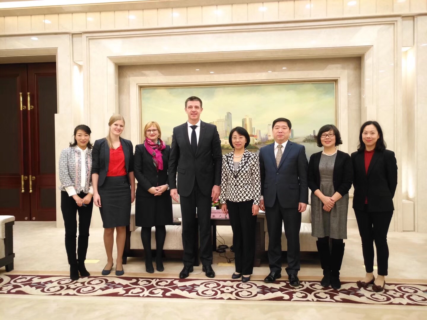 2017年12月14日上午十點(diǎn)在國(guó)貿(mào)公司會(huì)議室,集團(tuán)總裁徐立勛先生會(huì)見(jiàn)了來(lái)訪的匈牙利上??傤I(lǐng)事Szilárd Bolla(博嵐)一行,國(guó)貿(mào)公司總經(jīng)理顧蔚軍女士攜總經(jīng)辦成員共同接待來(lái)訪外賓。