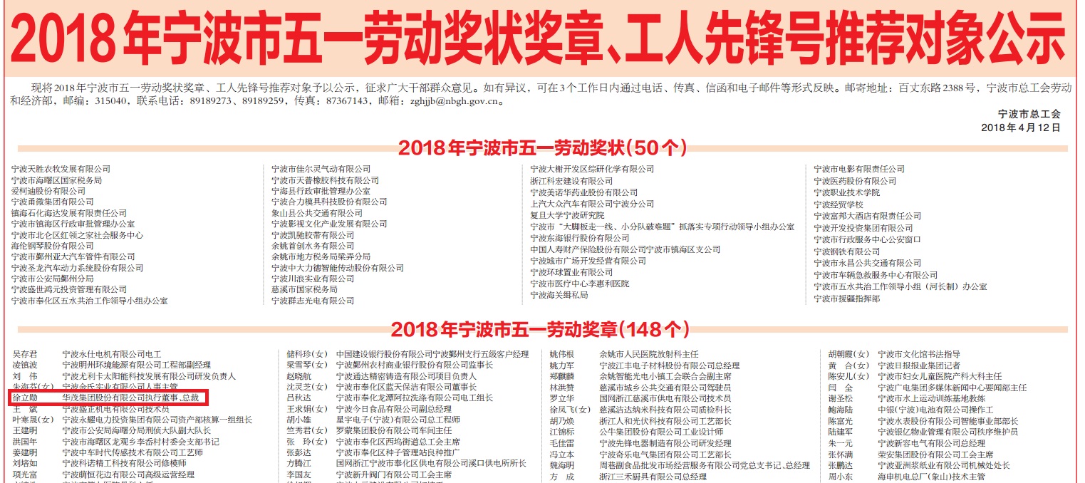 熱烈祝賀徐立勛總裁榮獲2018年寧波市五一勞動獎章