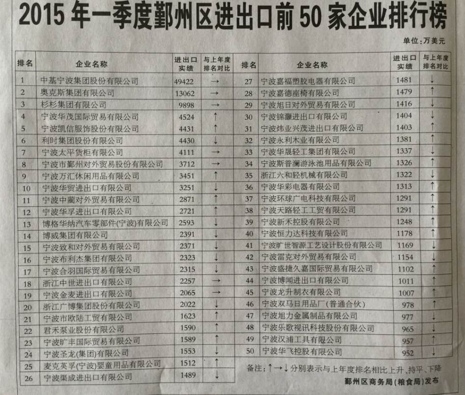 我司榮列2015年一季度鄞州區(qū)進(jìn)出口企業(yè)排行第四位