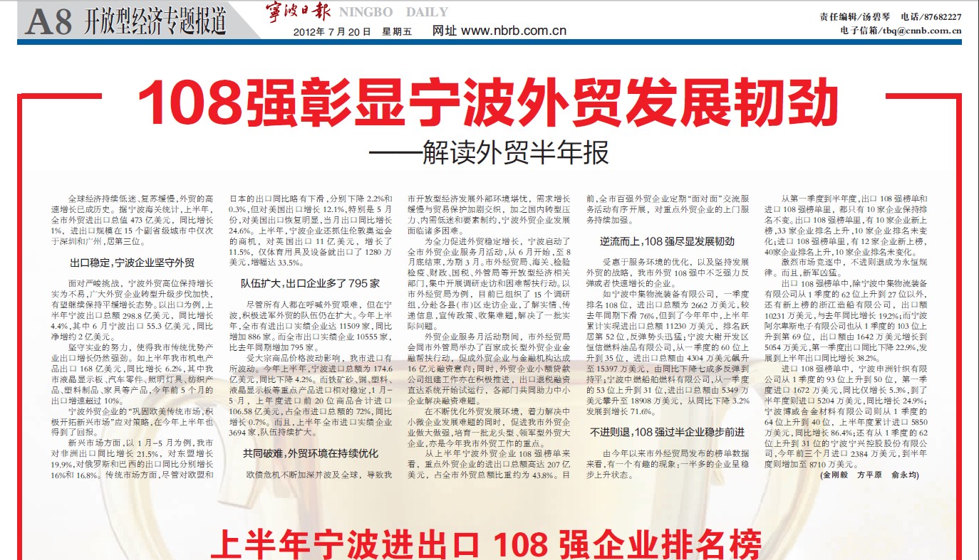 上半年寧波進(jìn)出口108強(qiáng)企業(yè)排名榜